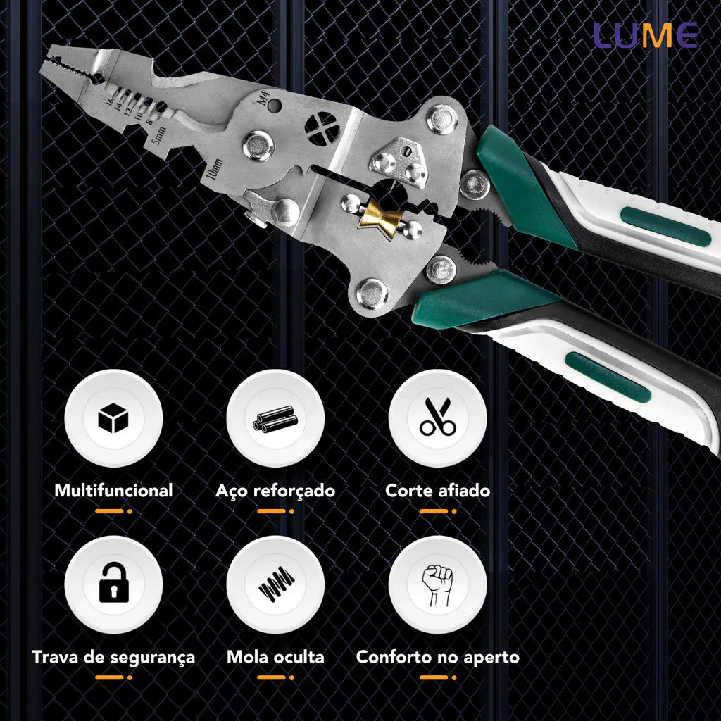 Alicate multifuncional dobrável para decapagem de fios com teste elétrico.
