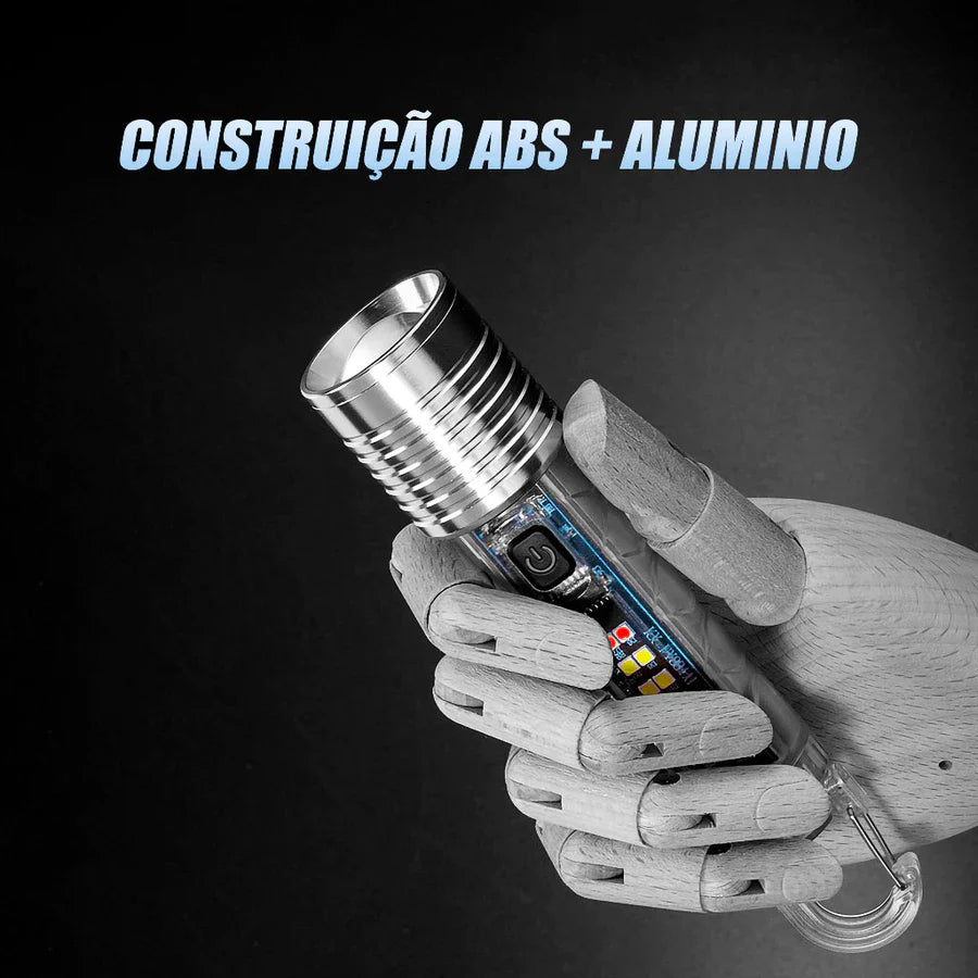 Foco telescópico com ajuste de extensão e retração suave, proporcionando uma iluminação não apenas intensa, mas também de longo alcance.